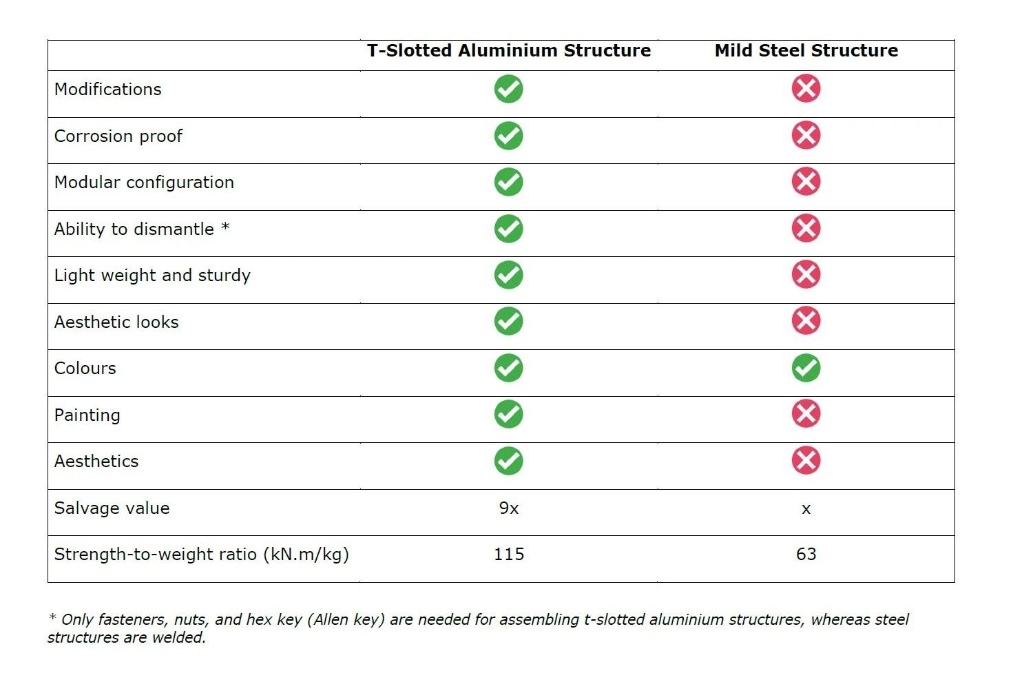 This is because, t-slotted aluminium structures offers unique advantages over similar structure made from mild steel. The following table draws a comparison between the structures made from aluminium versus mild steel.